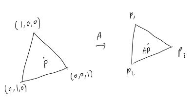 는 [0,1] X [0,1] 을 (1,0,0), (0,1,0), (0,0,1) 을 꼭짓점으로 갖는 삼각형 안의 점(P)으로 uniform 하게 변환한다. (1,0,0), (0,1,0), (0,0,1)을 sampling된 삼각형의 각 꼭짓점(P0, P1, P2)으로 변환하는 행렬(A)을 찾아서 P를 A로 변환한 AP를 구하면 sampling한 삼각형 안에서 sampling된 점의 좌표를 구할 수 있다.