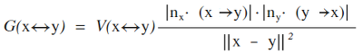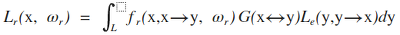 L은 광원의 표면이고, y는 광원의 표면 위의 한 점이다. 즉 광원 위의 모든 점 y에 대해서, y에서 x로 향하는 radiance를 fr과 곱하고, dw를 dy로 바꾸는 과정에서 생긴 Geometric term G를 곱한다. 여기서 G는 다음과 같다.