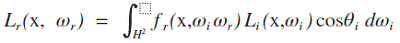 X는 렌더링이 될 점, wi는 X에서 광원으로의 방향, wr은 X에서 카메라로의 방향이다. Θi는 X에서의 법선 벡터와 wi 사이의 각도이다. fr(X, wi, wr)은 물질이 X에서 wi로 오는 빛을 wr로 얼마나 반사하는지 나타내는 함수이고, Li(X, wi)는 X에서 wi 방향으로 도달하는 radiance를 나타낸다. H2는 X를 시점으로 하는 모든 방향, 즉 X를 중심으로 하는 반구를 뜻한다. 주의할 점은, 위의 식 뿐만 아니라 앞으로 나오는 모든 벡터는 보통 점으로 들어가는 방향이 아니라 점에서부터 나가는 방향을 의미한다.