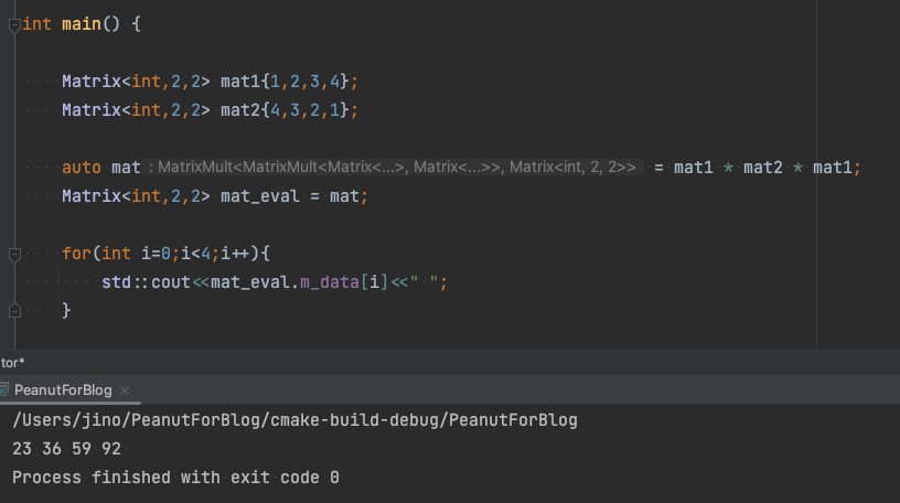 전체 코드는 다음과 같다. MatrixMultNaive를 생성하는 operator*() 함수도 operator+*()와 같이 만들 수 있다.